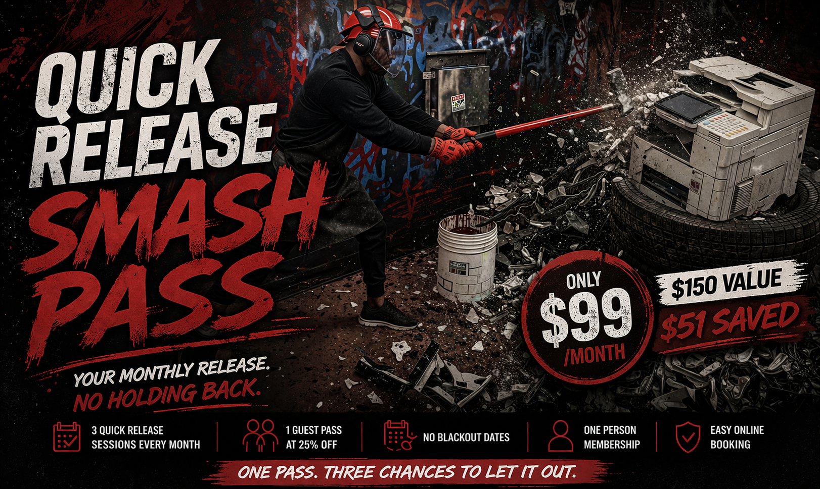 Make your monthly reset official. Feeling the pressure build up? The Breaking Point Quick Release Smash Pass is your ticket to consistent catharsis. Say goodbye to holding in frustrations and hello to your personal pressure release valve. It's more than just breaking things; it's a commitment to making room for a better mood, every month. Every billing cycle, you’ll receive three dedicated Quick Release sessions.